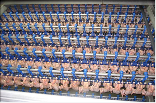 ▲Air chilling is the standard in Europe. The carcasses are hung on shackles and moved through coolers with rapidly moving air. The process is less energy-efficient than water chilling, and the birds lose weight because of dehydration. Air chilling prevents cross-contamination between birds. However, if a single bird contains a high number of pathogens, this pathogen count will remain on the bird. Thus, water chilling may actually result in a lower overall bacterial load, because many of the pathogens are discarded in the water.